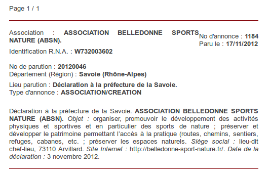 - Déclarée à la préfecture de Savoie le 3 novembre 2012 sous le numéro W732003602