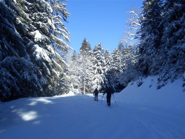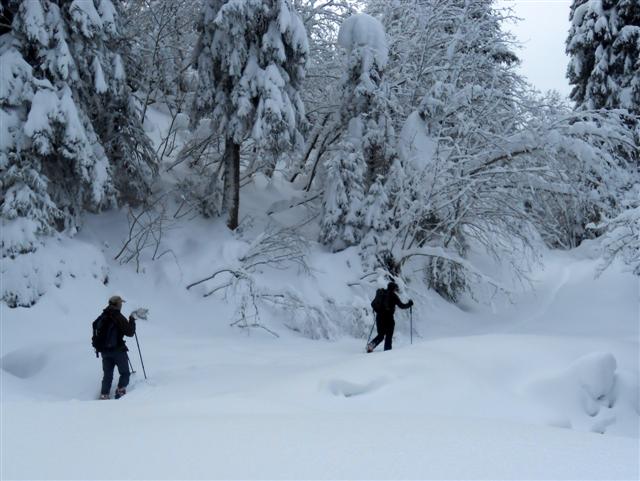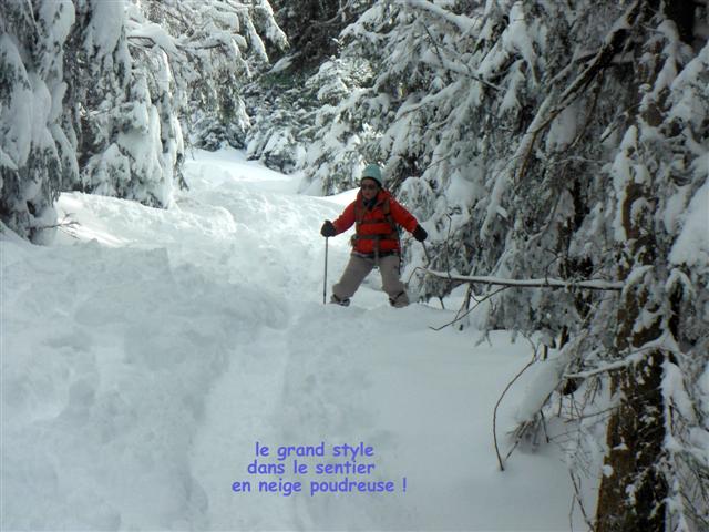 La descente par le sentier forestier que l'on "prend" à la montée à 1250 m, a permis de renouer avec le style "coulé" pour certains, chasse-neige antédiluvien pour d'autres, "bûches" en profonde, style raquettiste "cool"... Un régal sans grosse fatigue !
