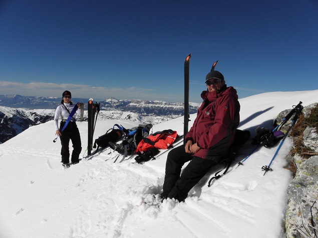 Peu importe le soleil, nous eûmes chaud dès le départ du parking du Grand Thiervoz, la piste forestière s’élevant rudement dès les premiers virages. Les manteaux furent vite retirés et soigneusement pliés dans les sacs à dos ! Sur ces pentes de basse altitude, la neige au sol encroutée voire verglacée par ces journées chaudes nous assurait de plus une stabilité des plus précaires … Quelques doubles axels et triples boucles piqués plus tard, nous sortîmes de la forêt pour atteindre la Premier Chalet de la Petite Valloire (1542 m). Désormais, la neige était plus accueillante, les espaces se dévoilèrent et la Chaîne de Belledonne offrit la splendeur de ses sommets. Le spectacle commençait !