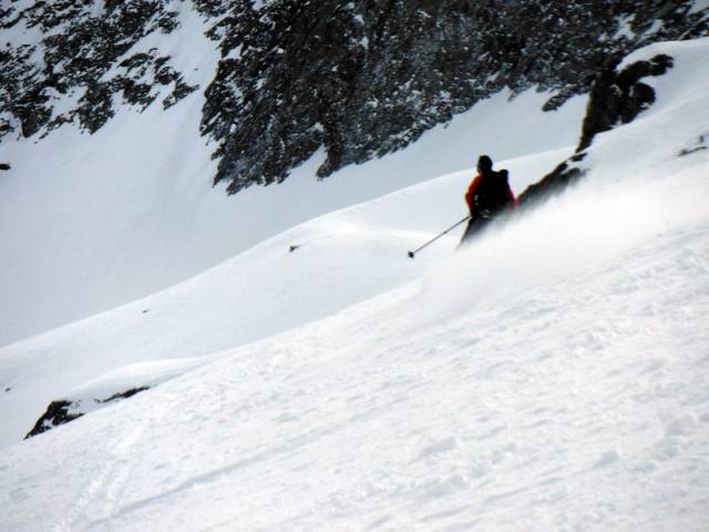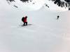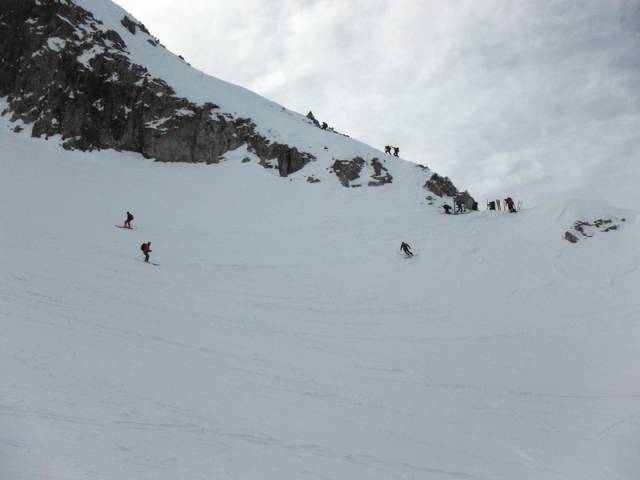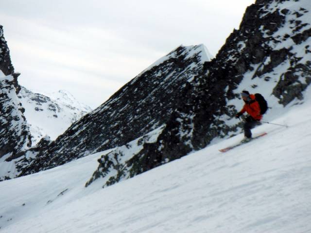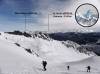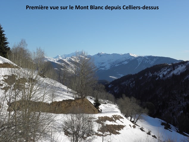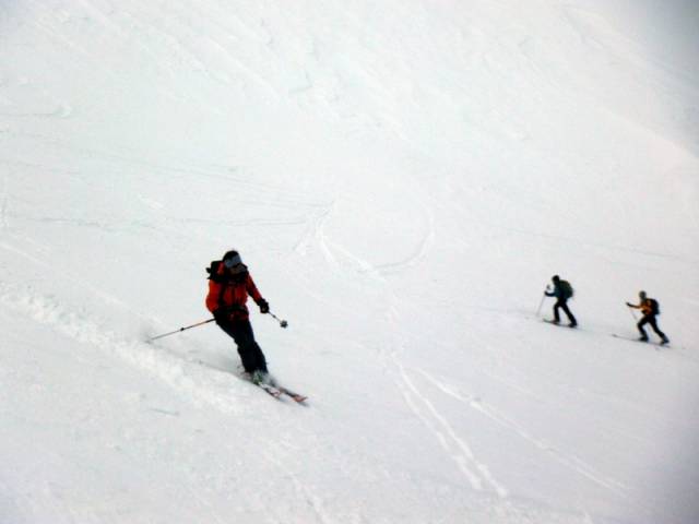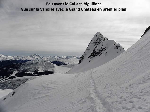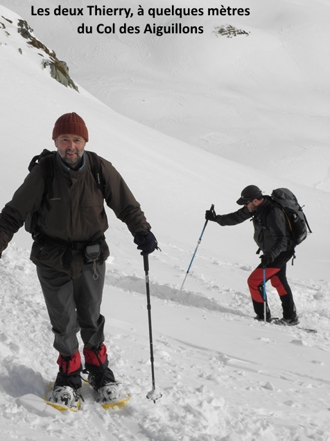 Au pied de ces aiguilles, peu avant le Col des Aiguillons, les skieurs de randonnée et les raquettistes prirent des chemins différents. Les premiers continuèrent jusqu’au sommet du Glacier de Celliers , à peine plus bas que le Grand Pic (et Julien jusqu'au Grand Pic), tous friands d’une longue glissade de presque 1600 m de dénivelée ! Les seconds, moins rapides à la descente, bifurquèrent dans la Combe de la Valette pour regagner la route du Col de la Madeleine, qu’ils pouvaient apercevoir quelques 900 m plus bas.