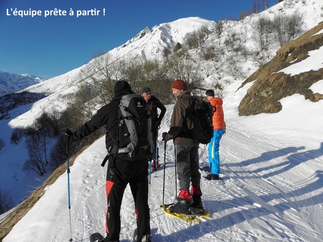 En ce matin du 8 mars, le soleil revêtait la plus radieuse de ses robes. Nous fûmes une dizaine à se garer au parking de Celliers-dessus, dans le Massif de la Lauzière, au pied du Grand Pic. Huit heures sonnaient au clocher trapu de l’église du village lorsque nous revêtîmes nos habits et chaussèrent notre matériel technique. Mauvaise surprise, hélas : les peaux de phoque de Didier étaient restées sur la banquise d’Arvillard, à quelques 75 km de là … Une seule solution : se rabattre sur une paire de raquettes, dans lesquelles il enfila ses chaussures de course en toile, doublées d’une paire de guêtres pour l’occasion.