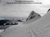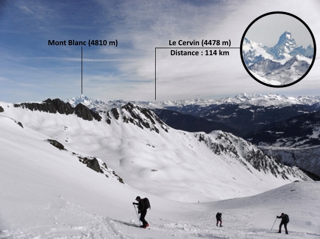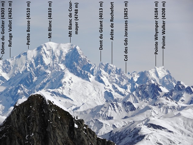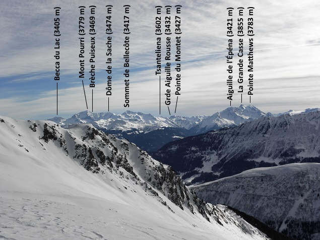 A chaque pause, de nouveaux sommets se révélaient à nos yeux : d’abord la Vanoise et la Tarentaise, avec la Grande Casse et le Mont Pourri ; puis le Massif du Mont Blanc, avec les impressionnantes Grandes Jorasses, la Dent du Géant, le Dôme du Goûter, et bien évidemment le Mont Blanc lui-même ! Plus loin encore, nous pûmes saluer quelques sommets des alpes suisses et italiennes, pour certains à plus de 100 km de nous : le fameux Cervin qui, sous cet angle, cachait pudiquement sa face la plus mythique ; le Grand Combin ; la Dent Blanche (à ne pas confondre avec le Weisshorn, non loin de là !) ; et plus au sud, la Tsanteleina. Cela n’empêcha nullement de contempler les Aiguilles de la Balme qui nous surplombaient majestueusement, et vers lesquelles la trace semblait nous conduire.