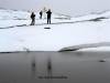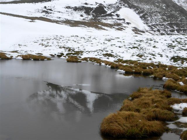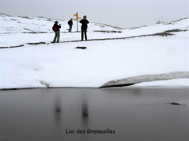 Toujours dans une brume fantomatique irisée par le soleil voilé, nous avons remonté les pentes assez vallonnées menant au col d'Arbarétan et au lac des Grenouilles, partiellement enchâssé dans la neige. Les grenouilles frigorifiées s'étaient cachées, dommage !