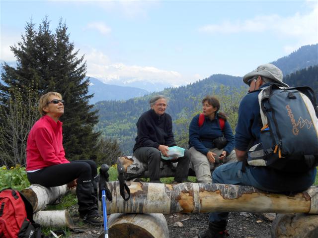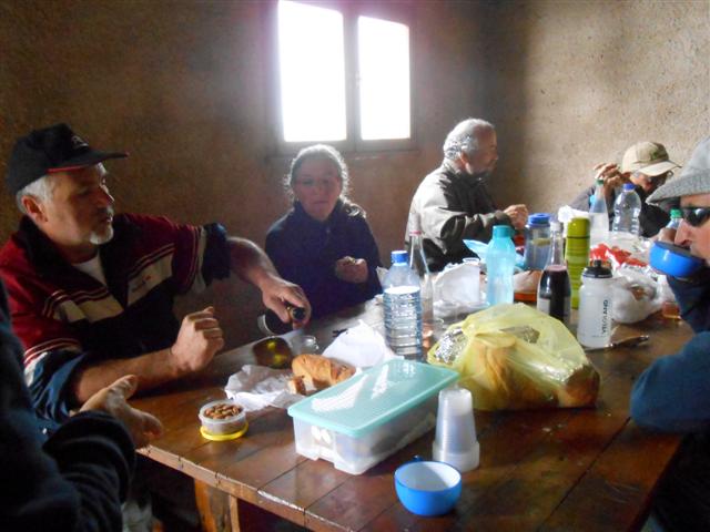 Pause gastronomique plutôt animée dans ce confortable chalet ; plusieurs "chefs" avaient cuisiné gâteaux et cakes, plusieurs épicuriens avaient prévu le bon vin, le génépi"maison", et tous, nous nous sommes régalés en tapant la discute à propos de nos associations respectives !