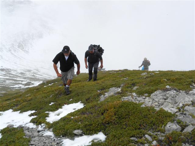 Une fois les libations terminées, direction le Grand Chat, par l'arête des Trois Mollards, sur laquelle nous traçâmes façon "sangliers", parmi les arcosses et les saxifrages ; des souvenirs pour les jours gris !