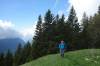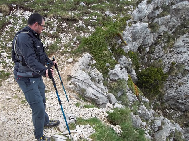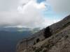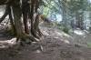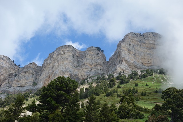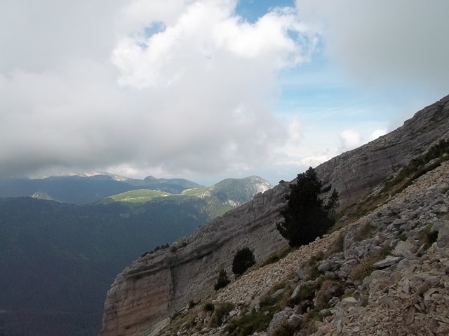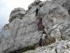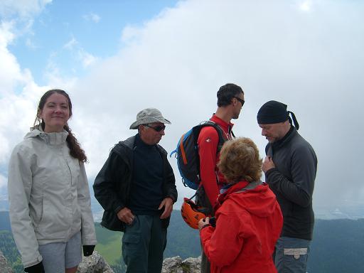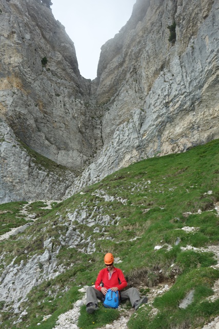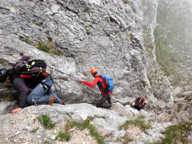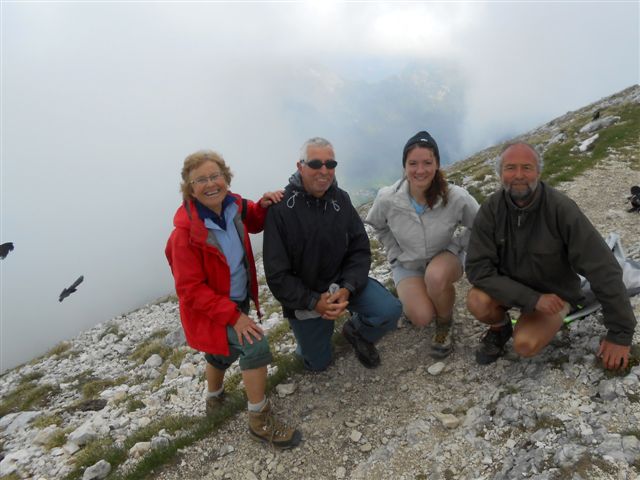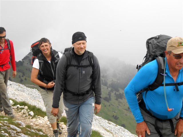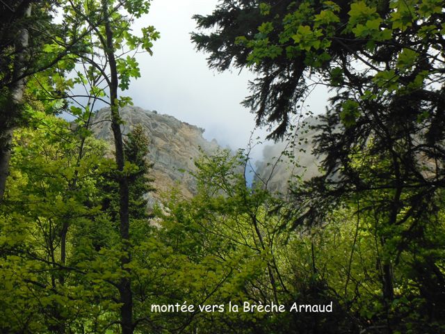 ). Arrivés sur la crête, nous avons une vue imprenable sur le blanc épais des nuages qui s’étaient accrochés dans la matinée aux hauts de Chartreuse. Tant pis, nous faisons tout de même quelques aller-retours jusqu’à la croix du sommet (à terre depuis peu) en attendant l’équipe de la Brèche Arnaud, pour nous réchauffer, et pour profiter du paysage à chaque trouée de lumière dans nos nuages laiteux.Seconde option (on rembobine et on repart de la cabane de Bachasson) : c'est au nombre de 4, Didier, Daniel, Ghislaine et Raphael que nous empruntons un sentier descendant et étroit sous les arbres, pour rejoindre un sentier peu marqué mais tracé sur la carte IGN, Didier est en tète, le sentier passe dans l'alpage à travers les gentianes et autres fleurs "inconnues" pour terminer en lacets assez raides au pied de la brèche Arnaud. L'équipe prend une part de cake au noix "maison" préparé par Ghislaine, met les casques, baudriers avec 2 longes. Daniel part en tête et on décide de s'encorder. Le câble est peu abîmé, les prises patinées et jonchées de petits cailloux, casque et patte de velours obligatoire