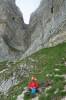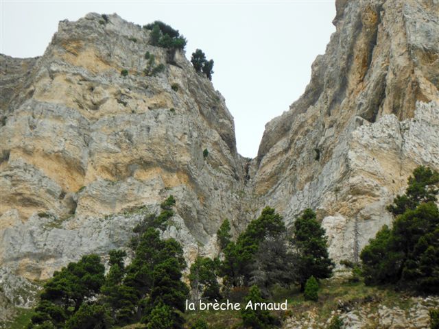 Seconde option (on rembobine et on repart de la cabane de Bachasson) : c'est au nombre de 4, Didier, Daniel, Ghislaine et Raphael que nous empruntons un sentier descendant et étroit sous les arbres, pour rejoindre un sentier peu marqué mais tracé sur la carte IGN, Didier est en tète, le sentier passe dans l'alpage à travers les gentianes et autres fleurs "inconnues" pour terminer en lacets assez raides au pied de la brèche Arnaud. L'équipe prend une part de cake au noix "maison" préparé par Ghislaine, met les casques, baudriers avec 2 longes. Daniel part en tête et on décide de s'encorder. Le câble est peu abîmé, les prises patinées et jonchées de petits cailloux, casque et patte de velours obligatoire