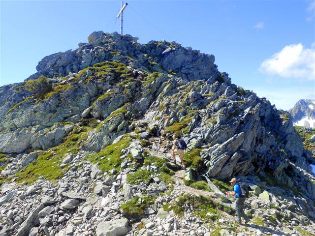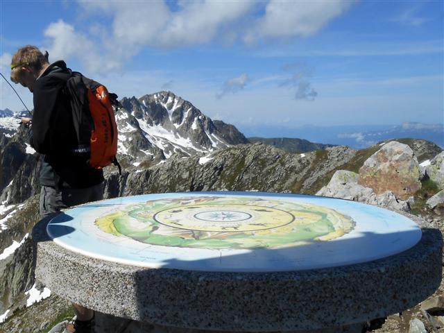 Un bout d'arête orientée vers le sud-est nous amène à la grande croix et à la remarquable table d'orientation du sommet.