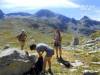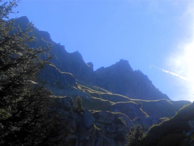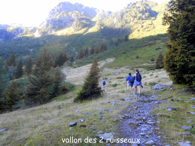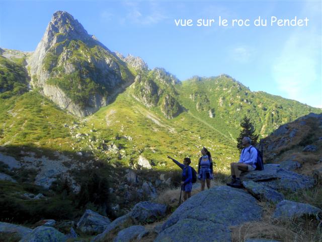 Après une petite heure de marche, nous (Jocelyne, Maylis, Geneviève, Thierry) bifurquons vers le vaste vallon des 2 Ruisseaux, qui nous mène jusqu'au replat d'un chalet en ruines (éponyme ), sous le sévère Roc du Pendet et en contrebas du sentier que nous emprunterons au retour. Sur notre gauche surplombent Chaurionde et les rochers du Mouchillon.