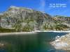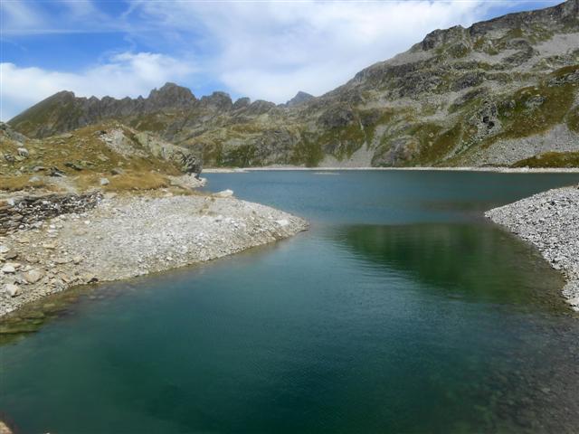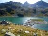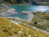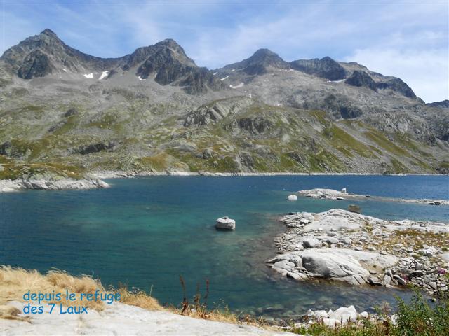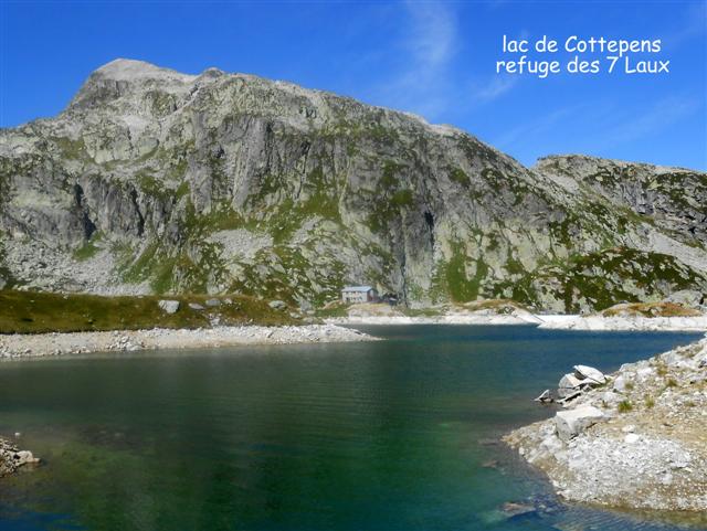 Retour au sentier du GRP, par lequel nous arrivons au large col des 7 Laux, à 2184 m, en longeant les lacs de Cottepens et du Cos, bleus comme en carte postale. A gauche, les accès au Rocher Blanc par le lac Blanc et le col de l'amiante ; à droite, le pic des Cabottes et ses dalles d'érosion glaciaire ; on devine la trace de montée au pic de la Belle Etoile.