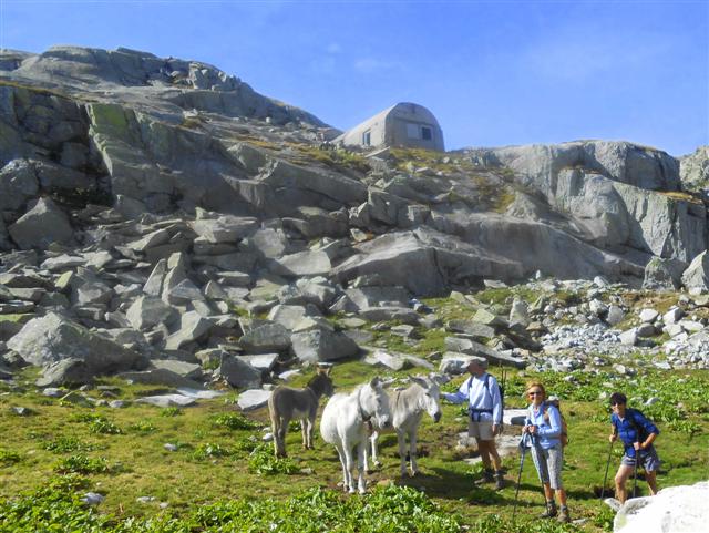 Arrivés au replat des 7 Laux, nous abandonnons le GR de Pays pour découvrir de petits lacs bordés de linaigrettes, 3 ânes paisibles broutant près d'un chalet d'alpage, et le lac de la Motte vert émeraude ; un chalet le borde, propriété des pêcheurs du coin, avec une sympathique "annexe" pour les randonneurs itinérants.