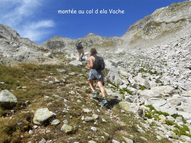 Un peu plus haut à l'ouest, le col de la Vache nous invite à une rapide montée jusqu'à ses 2534 m. Nous sommes immergés dans la pierraille belledonnienne, pieds agiles et estomac vide ! Ce passage minéral permet la traversée vers le Pas de la Coche.