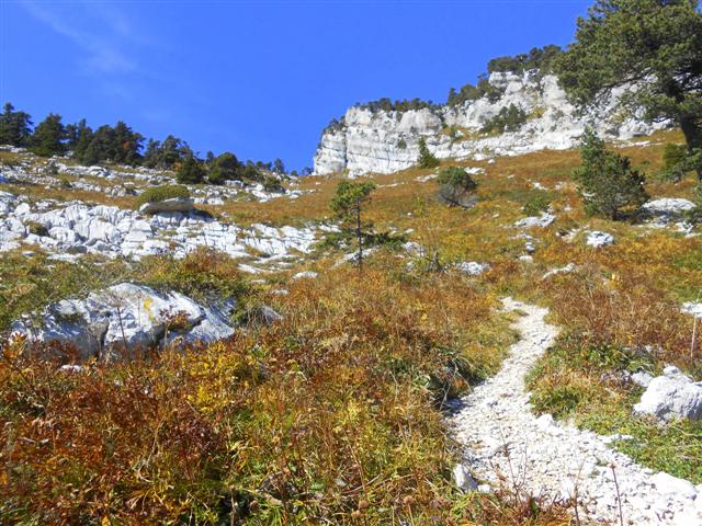 de la gravure romaine, située à 1880 m, en contrebas d'une brèche située en partie nord des crêtes des Lances de Malissard. Passées les ruines de habert de Marcieu,une sente part à l'ouest ( 1609 m ) ; absolument sinueuse au milieu des gentianes, pins et prairies sauvageonnes, elle mène à l'attaque finale en zigzags caillasseux.