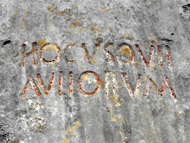 Ouf, enfin l' excitante remontée dans le temps ! La gravure est bien là, rouge délavé sur gris : " HOCUSQUII AVIIORUM ". Quid de la signification ?