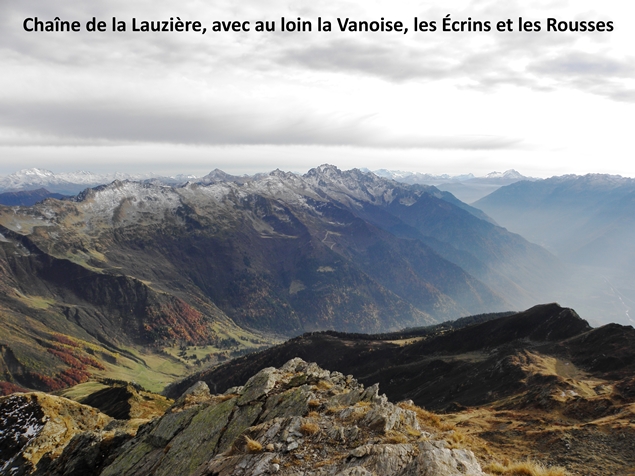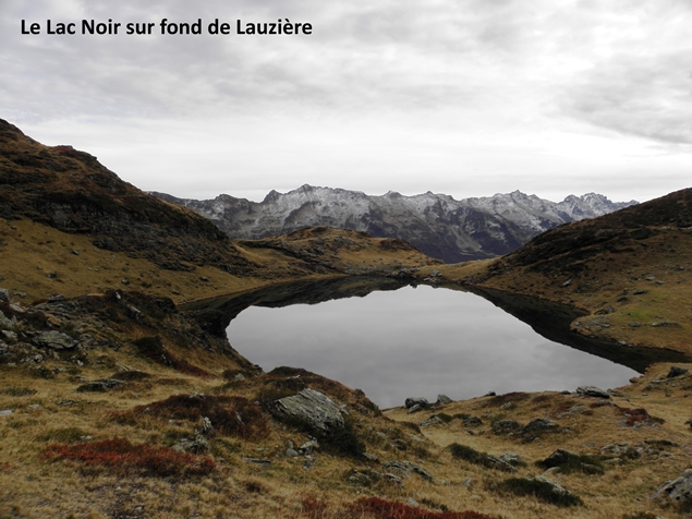 J'ai posé la voiture à Tioulévé à 14h15, très tard dans la journée. Au programme : montée par le Pas des Chèvres et le Lac Noir, puis descente par le Char de la Turche. Le ciel, bien couvert le matin, se dégageait peu à peu au fil de la montée, pour mon plus grand plaisir ! Les pics enneigés fleurissaient un peu partout à mesure je montais : d'abord les lames de Belledonne, puis le Pic de l'Étendard, la Vanoise, les Écrins, le Beaufortin, le Grand Combin au tout loin, et enfin le Mont Blanc (coiffé de nuages pour l'occasion), visible uniquement au sommet du Grand Arc !