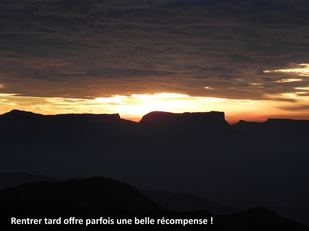 Encore un beau panorama, un grand classique du coin ! Et petit plus à la descente de fin de journée : un magnifique coucher de soleil sur le Mont Granier