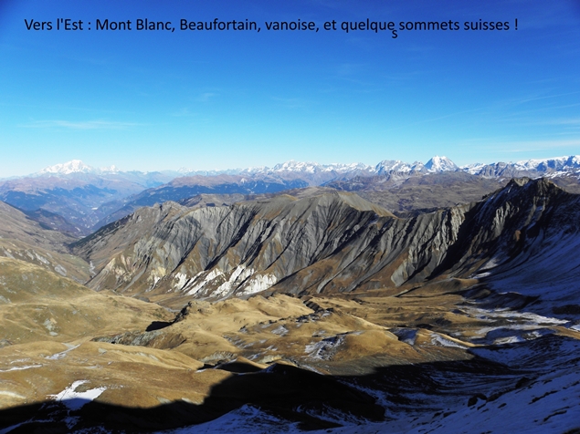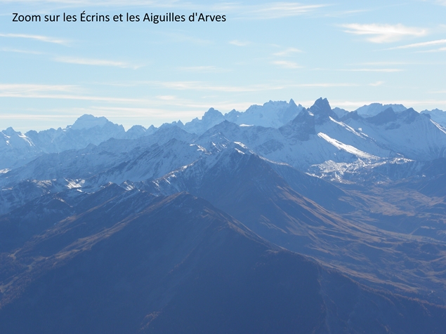 Au sommet, tout est calme et magnifique. Ce sommet étant parmi les plus hauts du coin (du Grand Coin même), le 360° est parfait, depuis le Mont Blanc, jusqu'aux Écrins, en passant par le Beaufortain, la Vanoise sur tout son long, le Massif du Thabor, le Pic de l'Étendard, Belldeonne sur tout son long également, une pointe des Bauges, la Lauzière, un soupçon d'Aravis et enfin le Haut-Giffre. Quelques sommets lointains de la Suisse viennent compléter ce panorama : Grand Combin, Couronne Blanche et Cervin. Plus loin encore, le Jura et le Massif Central définissent l'horizon. La carte postale idéale devant laquelle se restaurer !