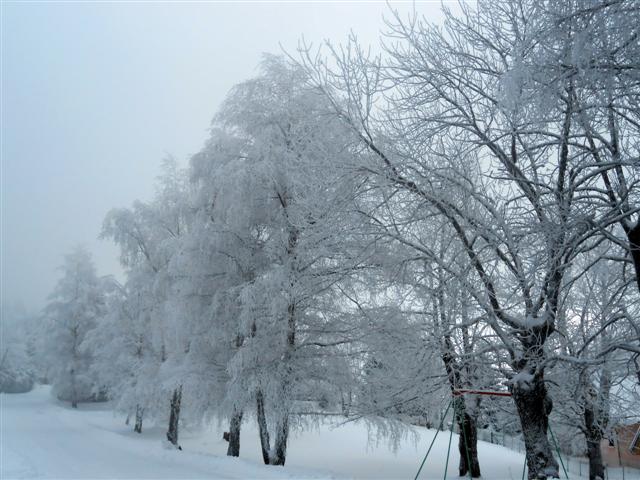 Jeudi 14 janvier : le ciel bouché, de l'humidité, de la neige à gros flocons ; Daniel et Didier s'en vont sans hésiter dans la vallée des Villards, comme prévu, et montent en direction du col du Merlet, en brassant bien la neige fraîche, jusqu' en contrebas de la Vieille Route.