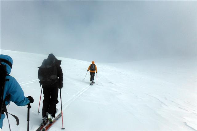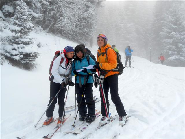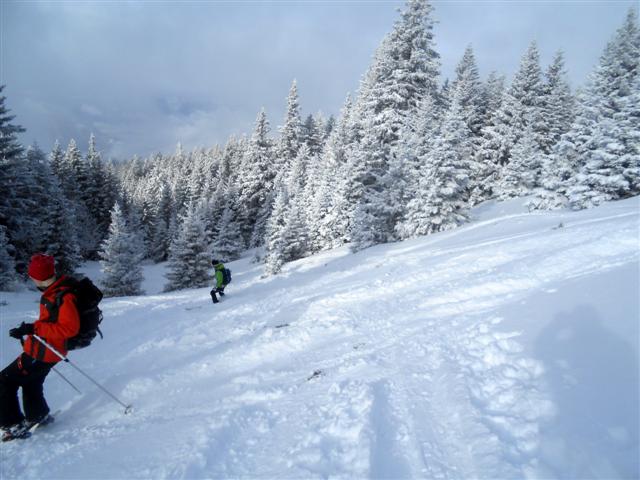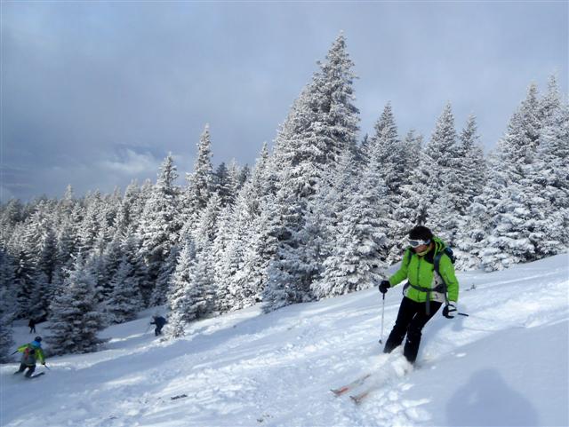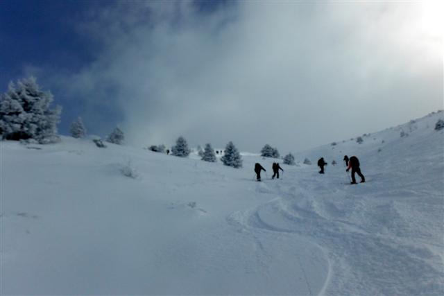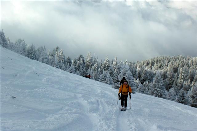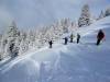 Dimanche 17, un groupe est monté jusqu'à 2400 mètres, sur les Crêtes de Brouffier, par une matinée sans vent et quelques éclaircies ; course cotée 2-1, avec des pentes maxi à 25°, choisie au regard du risque avalanches annoncé 3 dans ce secteur ; une neige de rêve, quoique peu épaisse, a permis de beaux virages à la descente et des glissades sympa pour les raquettistes.