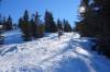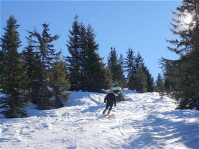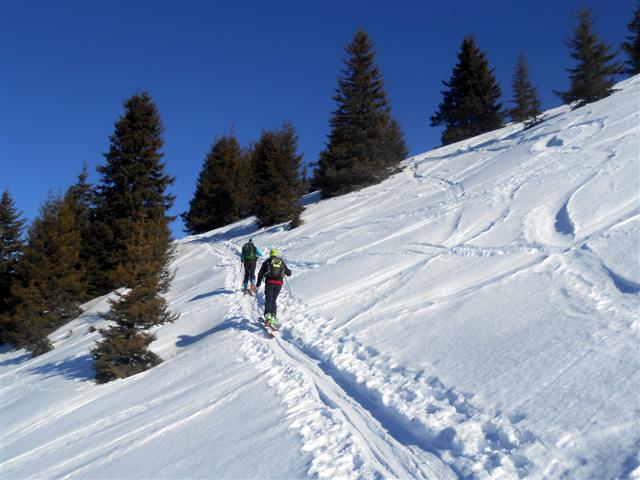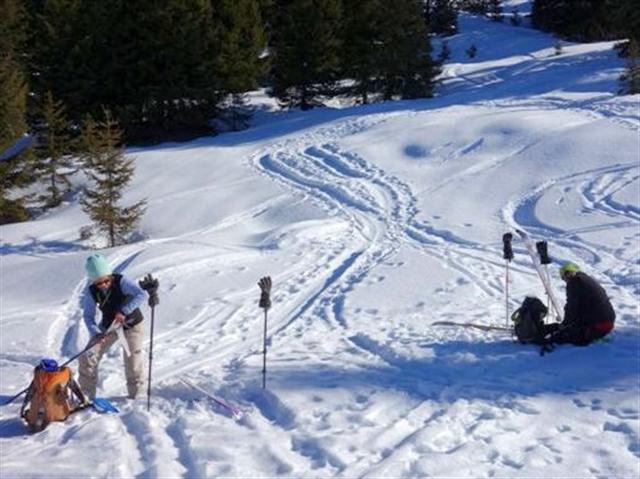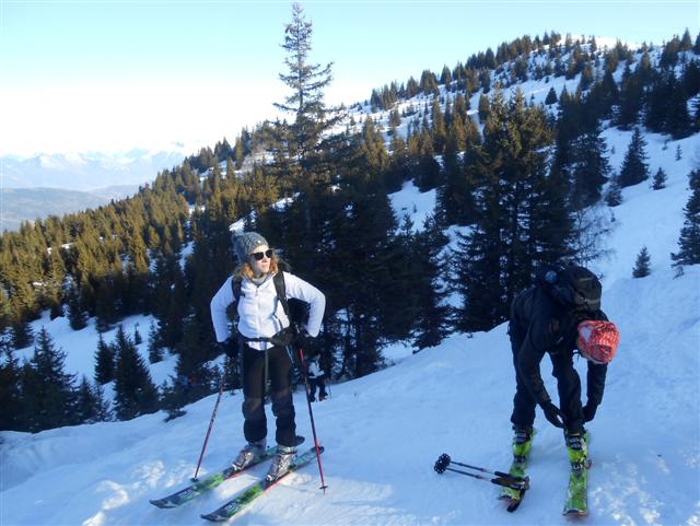 Ghislaine profite d'une pente marquée pour rappeler la technique des bâtons qui permet de mesurer l'inclinaison de cette pente, sachant que le risque d'avalanche augmente considérablement pour des pentes >30°. Nous traversons la forêt pour déboucher sur la crête qui mène au Grand Rocher et le soleil nous éblouit autant que la découverte des pics de Belledonne qui nous étaient cachés jusque là.