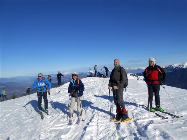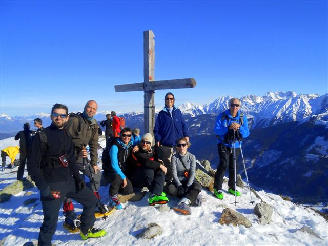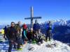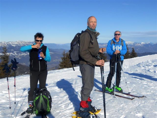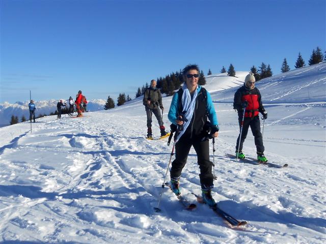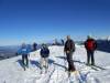 Encore quelques efforts et nous rejoignons à 11h30 la foule des skieurs déjà arrivés à la croix qui marque le Grand Rocher. Nous trouvons une bonne âme pour faire la traditionnelle photo de groupe et nous entamons un casse-croûte bien mérité. Le panorama est splendide et le ciel s'est mis au diapason si bien qu'on peut voir jusqu'aux monts du Jura. On vous laisse admirer les photos !