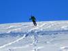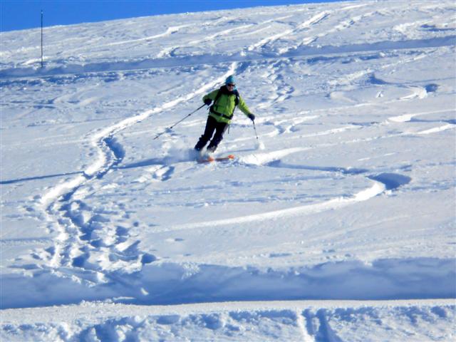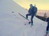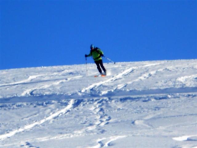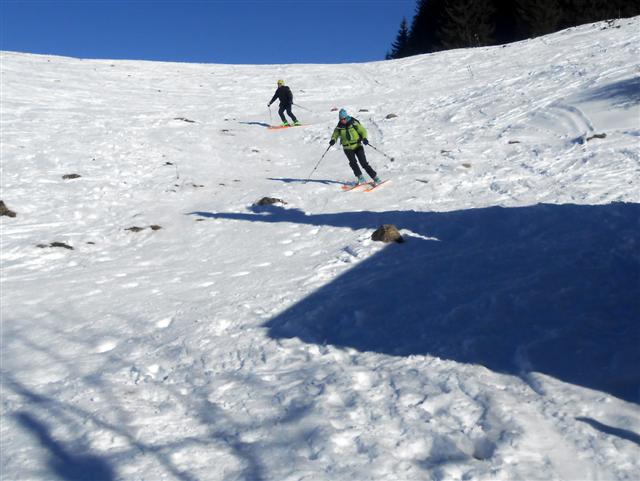 Pour la descente, le groupe se scindera en 2 selon 2 options : - Clémentine, Simon, Guy et Thierry redescendent par l'itinéraire de montée - Geneviève, Ghislaine et Raphaël se lancent dans la pente ouest sous la croix pour profiter d'une bonne neige et d'une descente un peu plus longue sachant qu'il faudra remettre les peaux pour en remonter une partie, avant de récupérer également l'itinéraire de la montée. Cette option valait le coup, même si, d'après Geneviève, la neige était plus légère 2 jours avant.