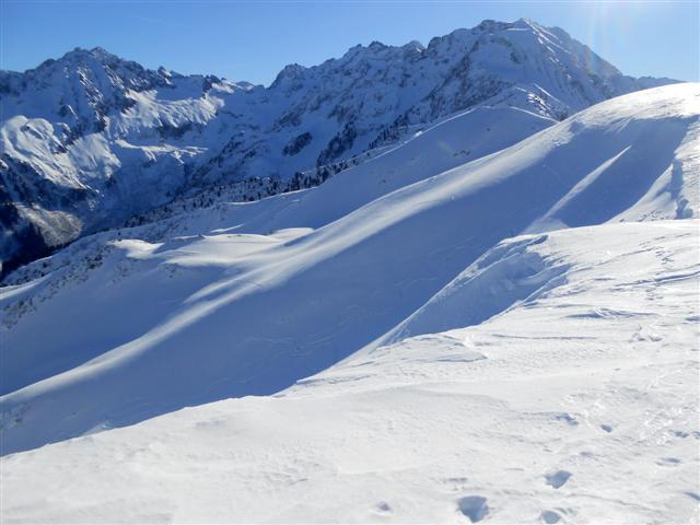 Au replat avant de passer sous le télésiège des Plagnes, la trace part sur la gauche, et amène à la crête surplombant le vallon du Bens. On arrive en haut du télésiège des Plagnes.