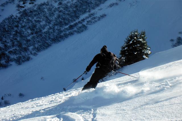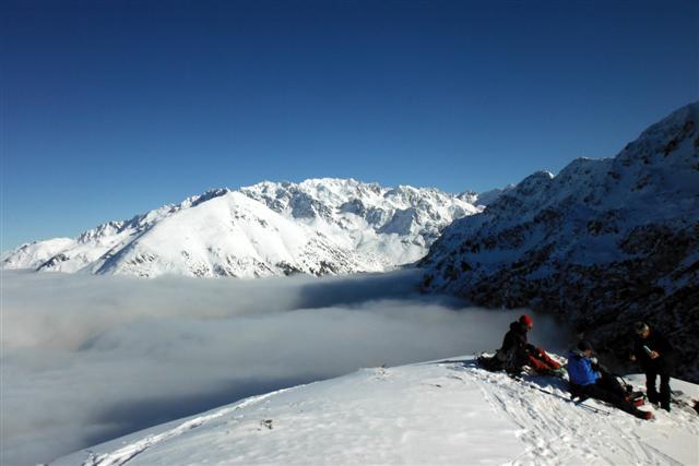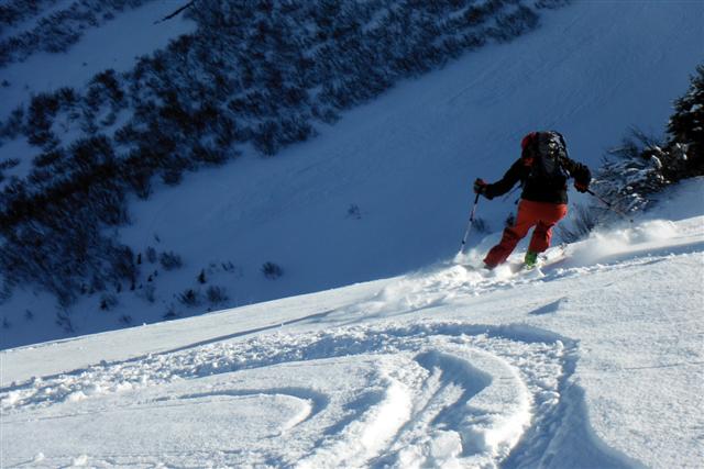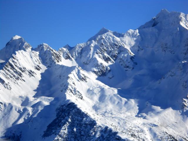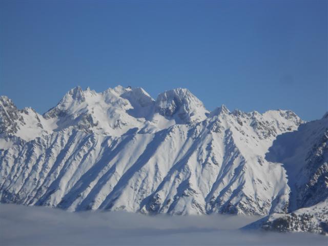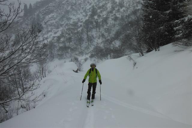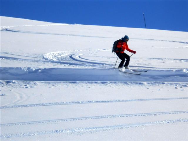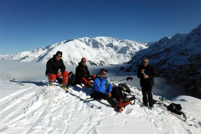 Le 21, neige poudreuse facile à manier, au-dessus de Prabert, malgré les vernes nombreuses dans le vallon sous le lac de Crop. Soleil bienvenu au sommet d'Orionde. Quatre compères heureux de partager leur passion : Jean-Noël, Daniel, Rosario, Jean-Claude.