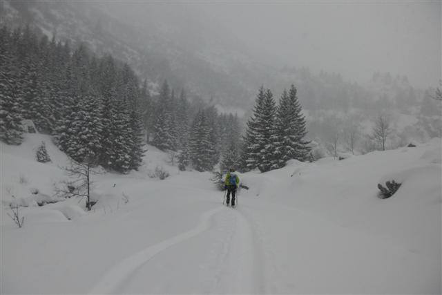 Le 14 janvier, averses de pluie et de neige, qui n'empêchent pas Didier et Daniel d'arpenter le vallon du Merlet, au-dessus de Saint Alban des Villards, jusqu'au lieu-dit La Vieille Route. La tempête autant que la sagesse leur dicte d'entamer la descente pour ensuite aller se réchauffer au bistrot du coin, en goûtant les spécialités locales offertes par le tenancier !