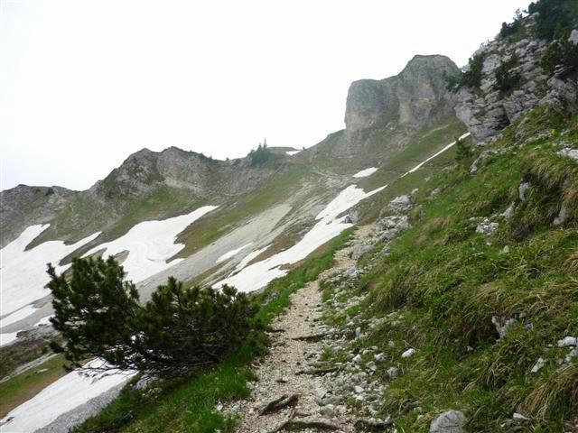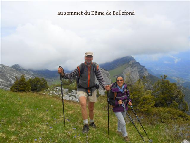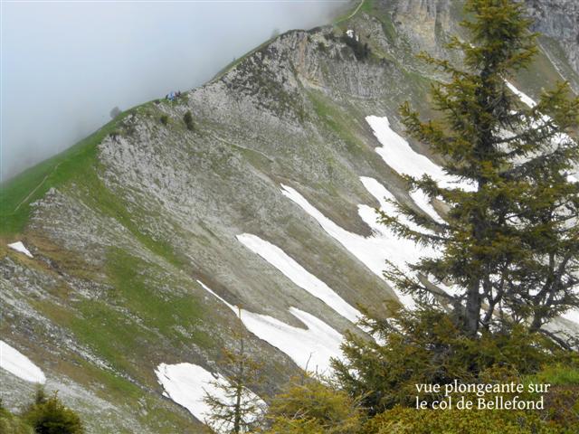 Près de 1300 m de dénivelée nous (Thierry, Geneviève) amenèrent parmi les vallons, lapiaz, dolines, vertes prairies, au col de Bellefond bien déneigé ; c'est une arête effilée qui se poursuit à l'est par le Dôme de Bellefond (notre itinéraire final) et rejoint à l'ouest la crête sud des Lances de Malissard.