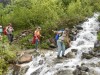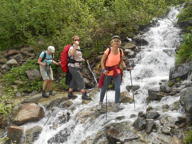 A la descente, le groupe traversa le Bens par la passerelle de Prénouveau, pour terminer sur une piste forestière côté Isère, débonnaire... sauf pour franchir à gué un torrent impétueux, par diverses méthodes et dans le fou-rire !