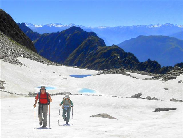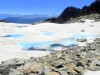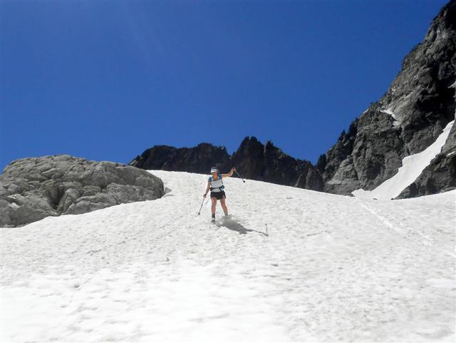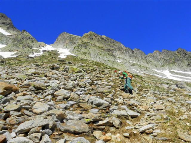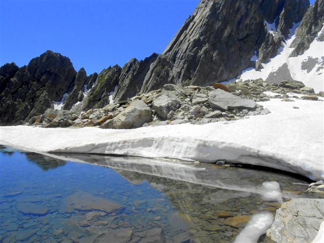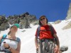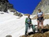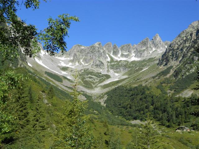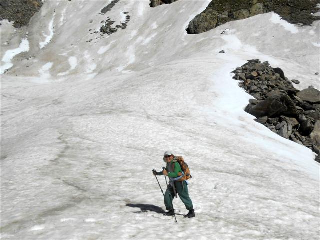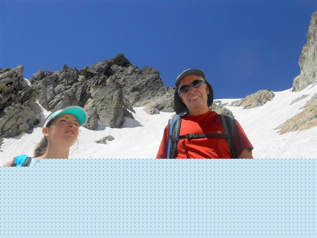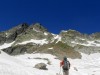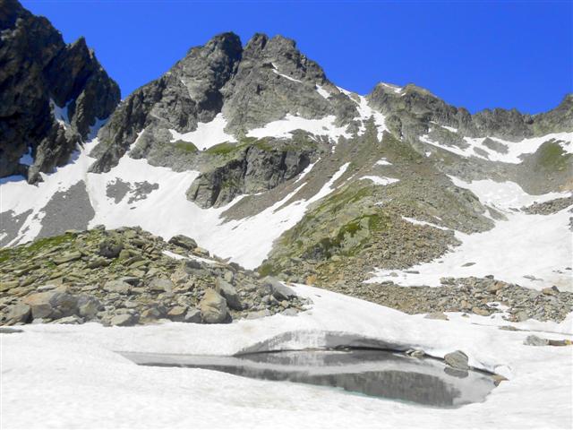 La face est du pic du Frêne se découvre au grand replat sous le col du Gollachon et la cabane éponyme (2000 m).On aperçoit la pente sommitale enneigée du col de la Vallette ; déjà aux lacs de la Vallette (2315 m), les névés facilitent la montée ; mais, avec nos sacs à dos légers et démunis de crampons, nous décidons de stopper à 2600 mètres environ, juste sous le col. La pente avoisine les 40 degrés et la glissade involontaire sur névé se terminerait sur les blocs de rochers...Dommage, il restait 207 mètres pour atteindre le sommet du pic du Frêne !