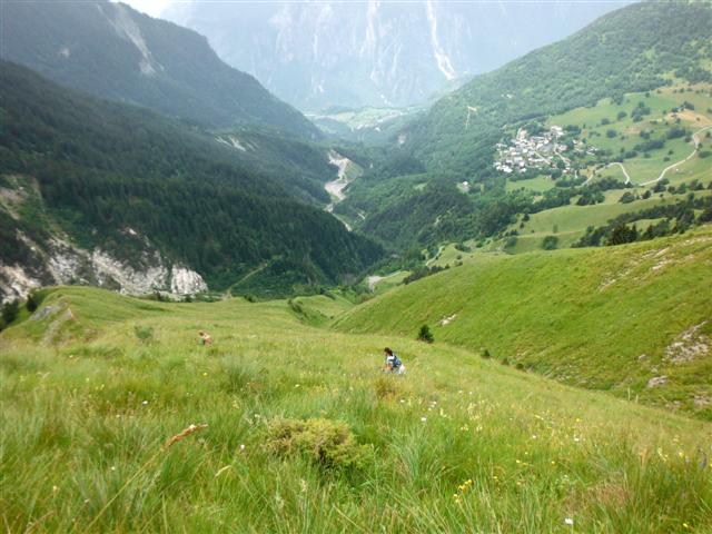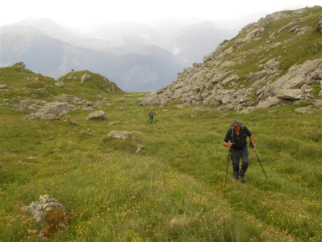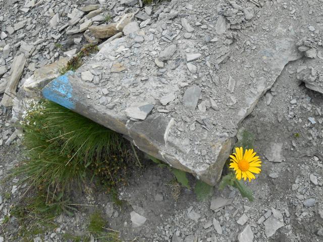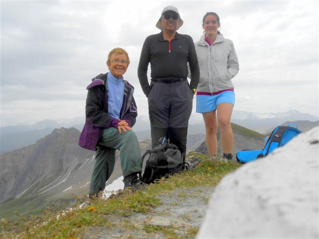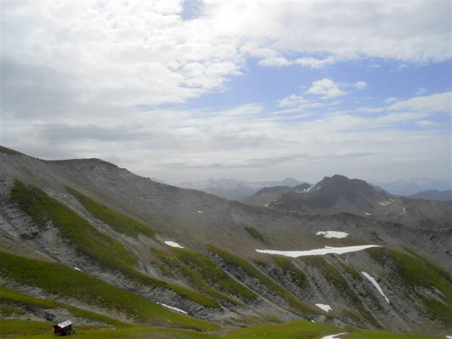 Le soleil a balayé quelques sommets lointains (Grandes Rousses, Belledonne, Lauzière, Vanoise), et sans attendre après un bref repérage des pics et vallons les plus proches, nous sommes descendus par Crêt Lognan (2696 m), la crête de Coin Lognan bordée de vastes éboulis shisteux et enfin la bien raide combe de l'Indrion, dans une vague trace parmi les herbes folles, les asphodèles et une multitude de fleurs colorées : un tableau des maîtres de la peinture pointilliste !