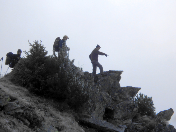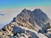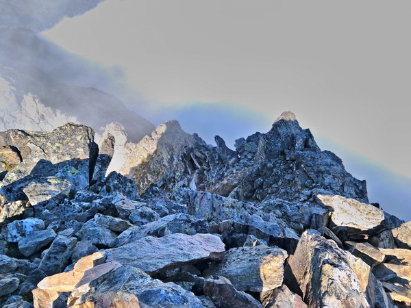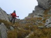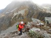 On rejoint le point culminant vers l'est par une arête en rocher rouge (quelques passages de 2 +).