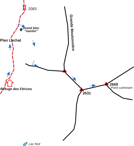 Du refuge des Férices (1920 m environ), suivre le sentier vers le nord, il descend légèrement puis remonte. Après Plan Lachat, au pied de la montées au collet 2083, on passe sous un grand bloc qui ressemble à un menhir.