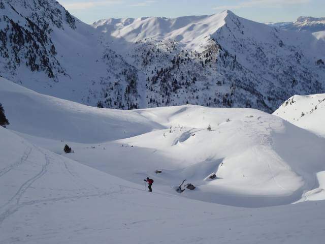 Descente en direction du refuge des Platières. Un tire à gauche un peu avant pour rejoindre la trace de montée.