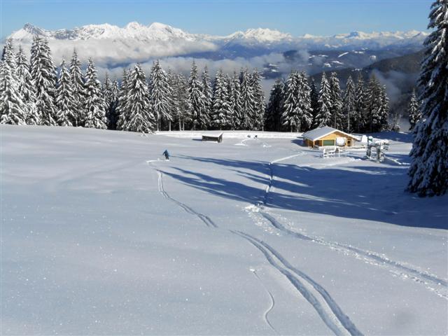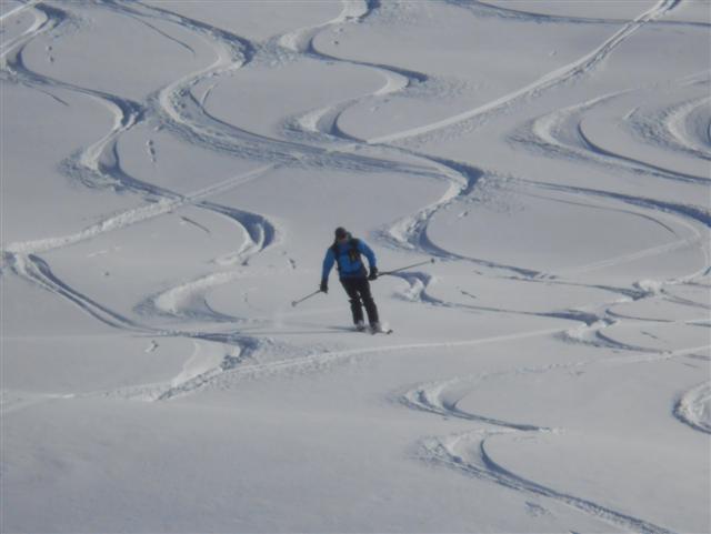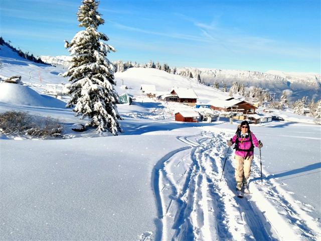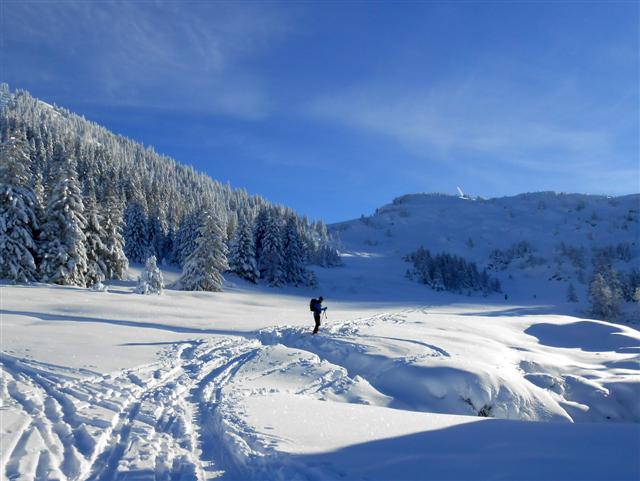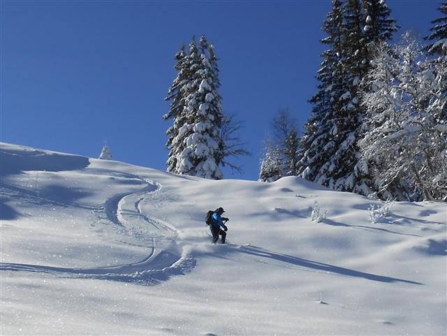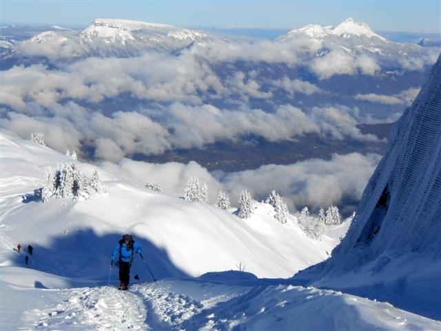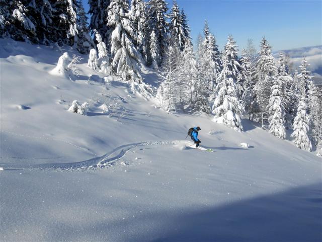 Descente de rêve sur la neige poudreuse légère, ornée des quelques arabesques des godilleurs ; on croise des sportifs illuminés de sourires, et l'on plonge sur Prérond (1575 m) dans une couche plus épaisse qui réveille les muscles des cuisses !