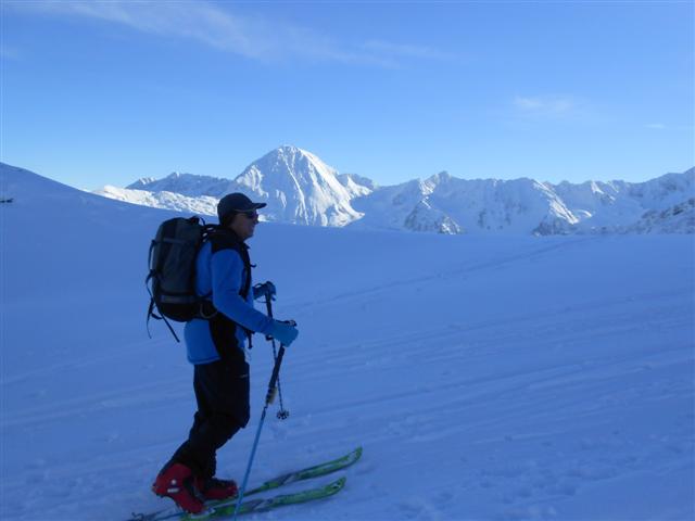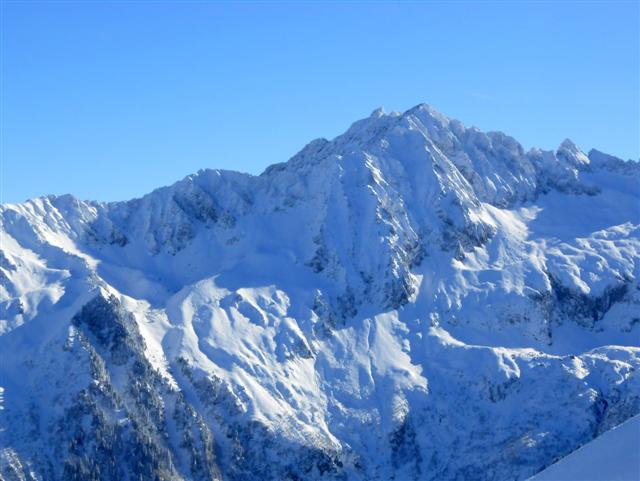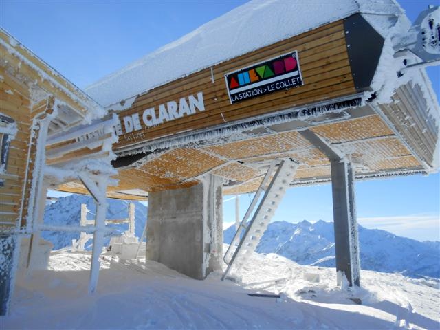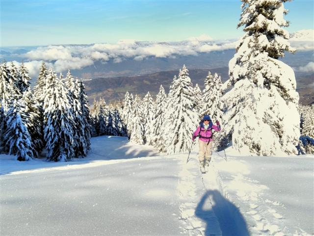 Samedi 12 novembre, départ du Super Collet d'Allevard (1630 m) pour une montée facile dans la trace déjà marquée par les skieurs lève-tôt ; passage au télésiège flambant neuf de Claran et arrivée aux Plagnes par les crêtes ventées (2100 m). Montagnes et arbres sont "meringués", le vent et le froid ont plaqué la belle neige nouvelle !