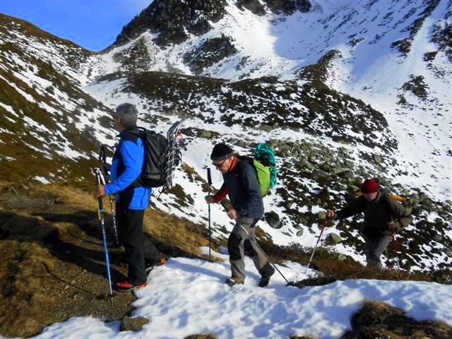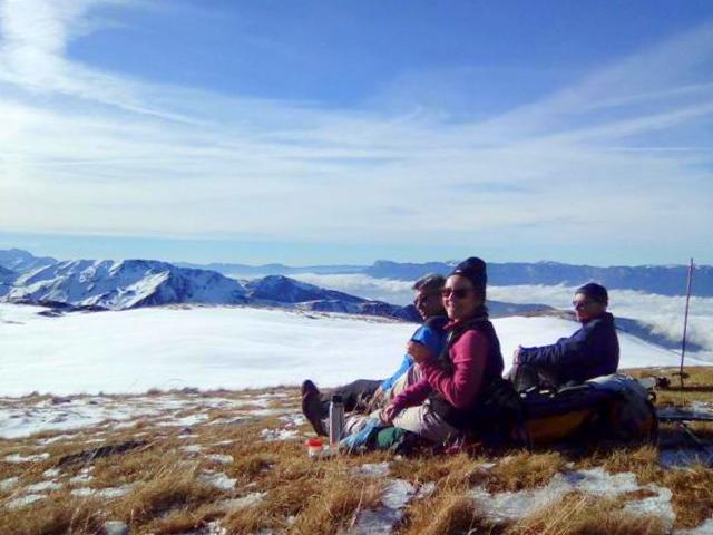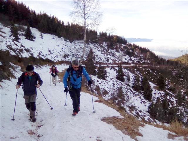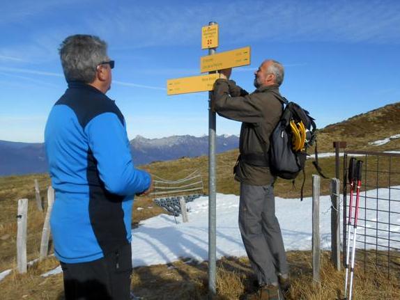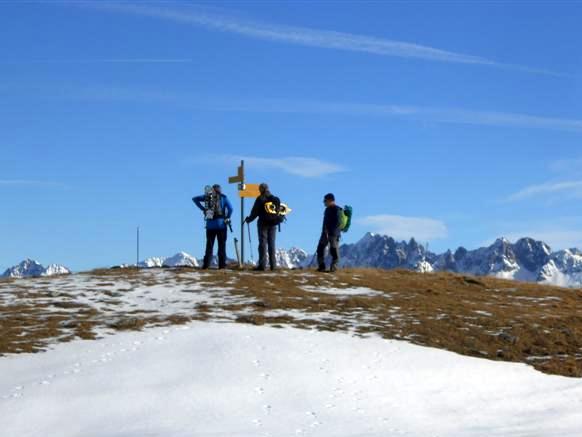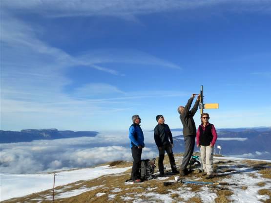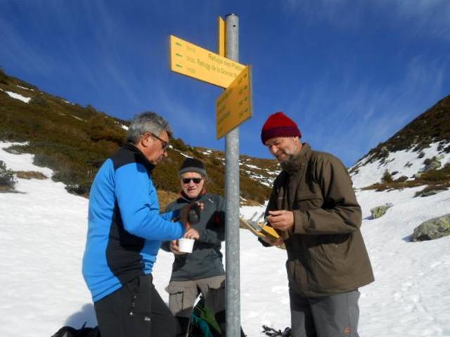 Quatre paires de raquettes multicolores ont pris l'air ce dimanche 27 novembre. Daniel, Bernard, Thierry et Geneviève partirent de la Chapelle de Prodin, à 1385 m, pour rejoindre le sommet du Chapotet (2076 m) ; ils s'étaient munis des raquettes, qui s'avérèrent inutiles, ainsi que d'une perceuse et d'une boîte à outils, lesquelles servirent à remettre en bon état plusieurs poteaux de signalisation jalonnant les sentiers de ce secteur.