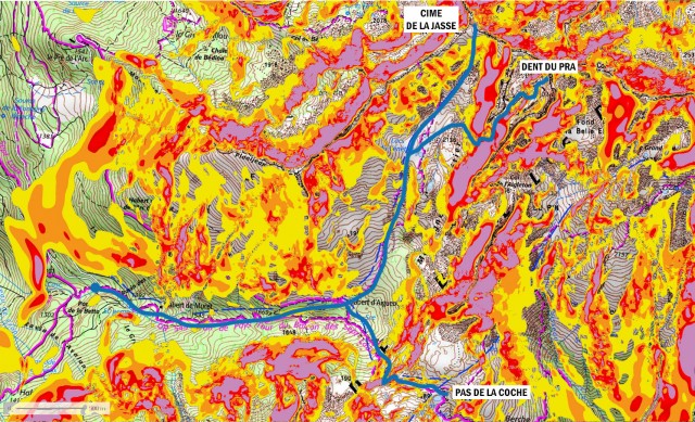 Cette visualitation des pentes supérieures à 30° est un outil décisif pour préparer une course en terrain enneigé (ski de randonnée, raquette, alpinisme...).