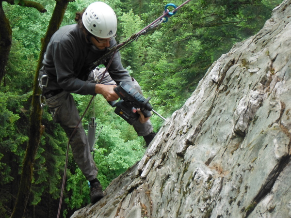 - Dimanche et lundi : repérage de voies, nettoyage, essais, marquage de l'emplacement des points d'assurage, perçage, pose des points d'assurage et des relais...