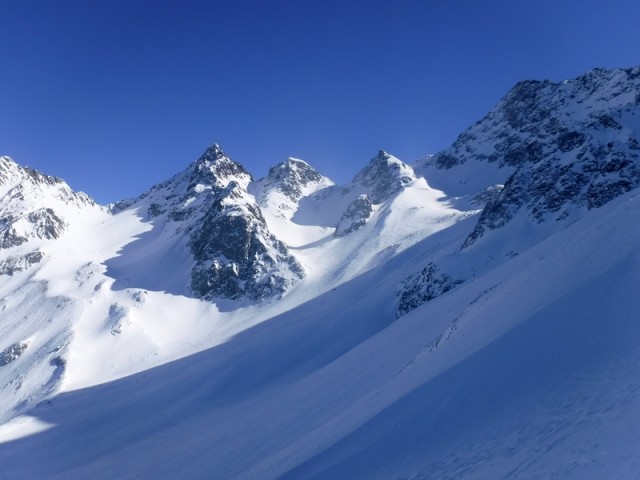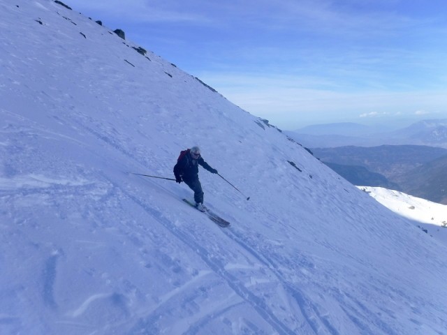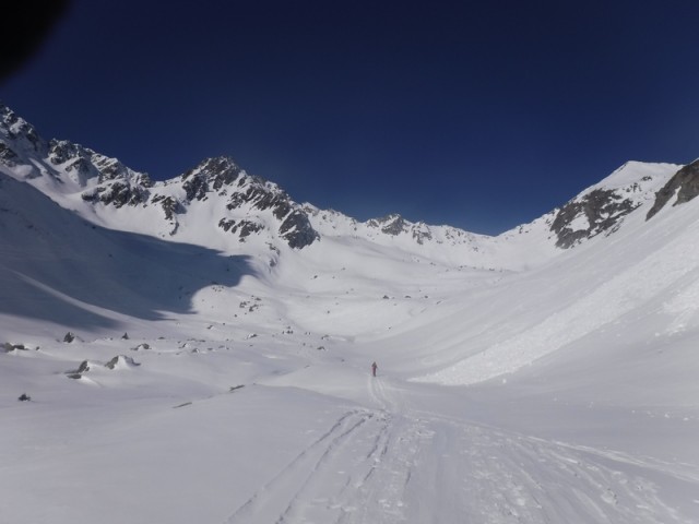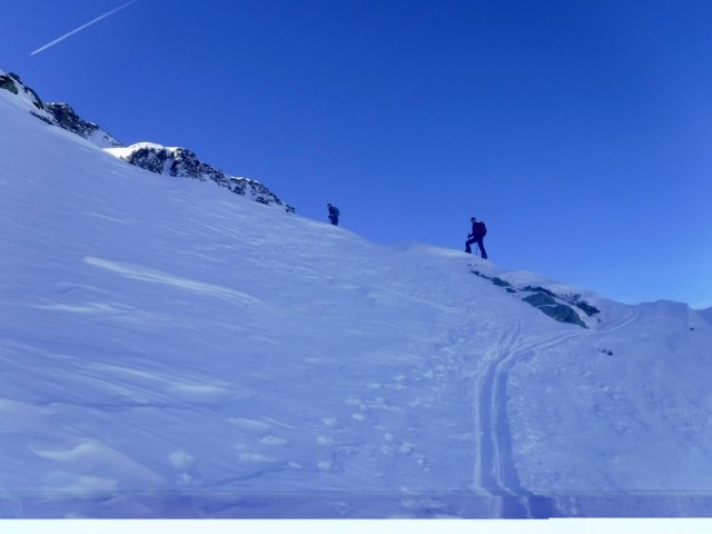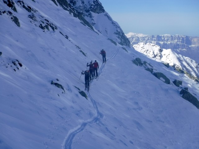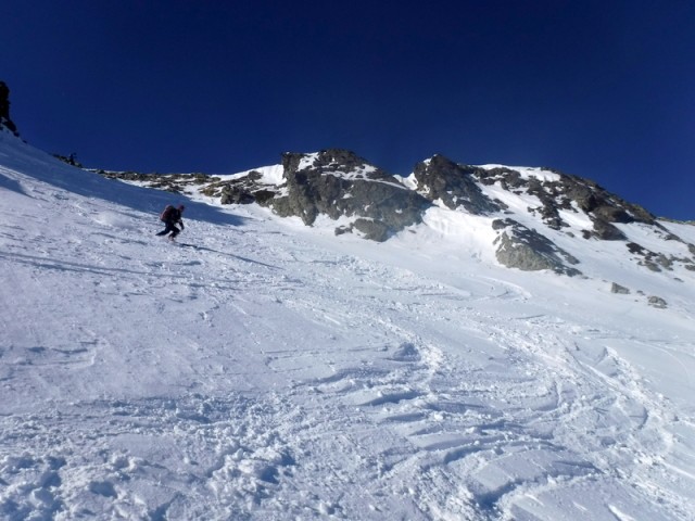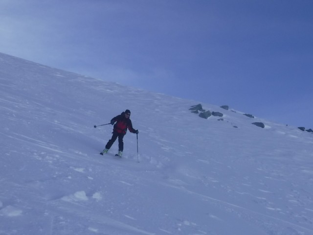 Encore une sortie dans le vallon du Merlet qui offre toujours beaucoup de possibilités. Démarrage skis sur le sac pendant 300 m de dénivelé. L'enneigement est vraiment déficitaire. Montée très agréable avec un ciel lumineux, pas trop chaud.