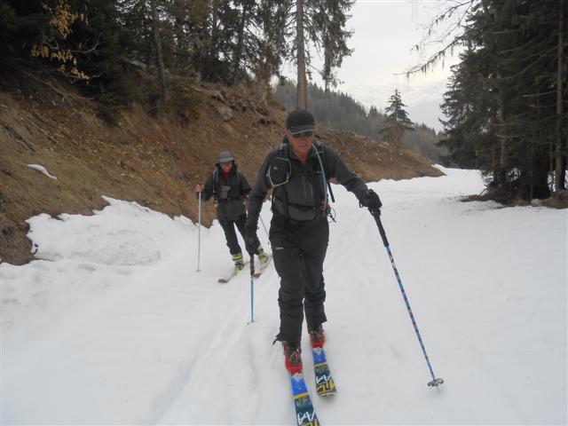 Ce jour plus blanc que blanc diminua quelque peu le plaisir de déraper sur la neige docile, mais c'était une bonne sortie en plein air ! Le casse-croûte se fit à l'abri de la maison forestière, et nous regagnâmes nos pénates en profitant d'une ambiance printanière au fur et à mesure de la descente dans la vallée des Villards.