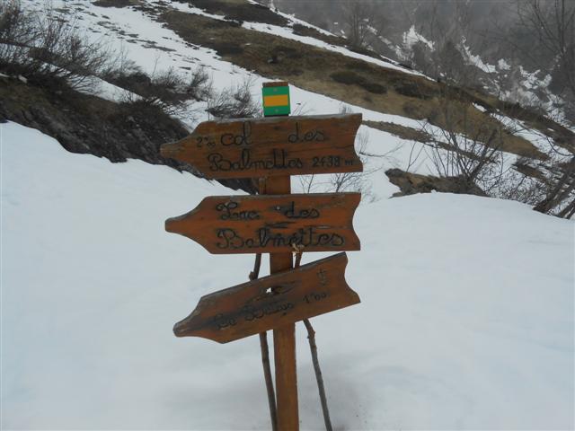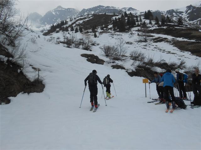 Pour le samedi 18 mars, la prévision météo était plutôt pessimiste ; en effet, dans la vallé des Villards, la voiture garée à 1423 m à la maison forestière O.N.F. de Frumezan, nous sommes montés à skis sous un ciel déjà gris le long d'une piste forestière qui nous amena au vallon des Balmettes, à 1741 m.