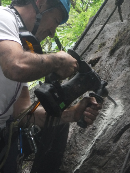 - perçage et nettoyage ; on part du haut, chaque équipeur en rappel (autoassuré évidemment) ; un qui perce, l'autre qui nettoie (soufflette et écouvillon)