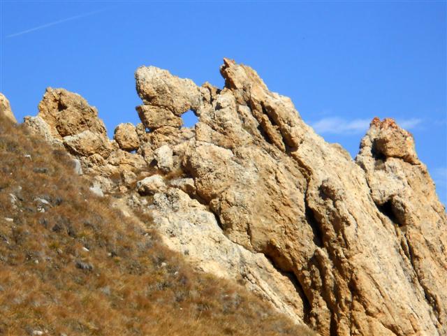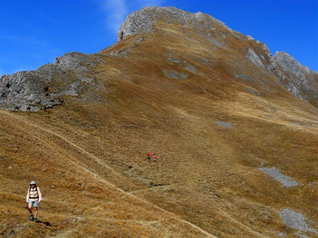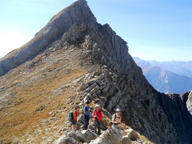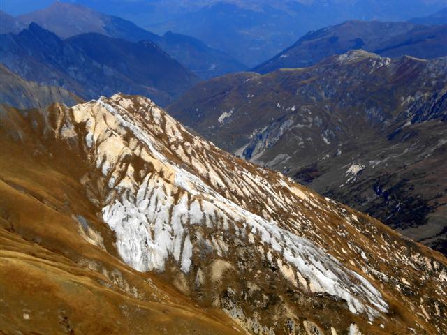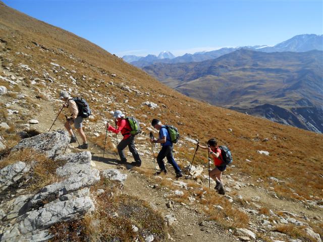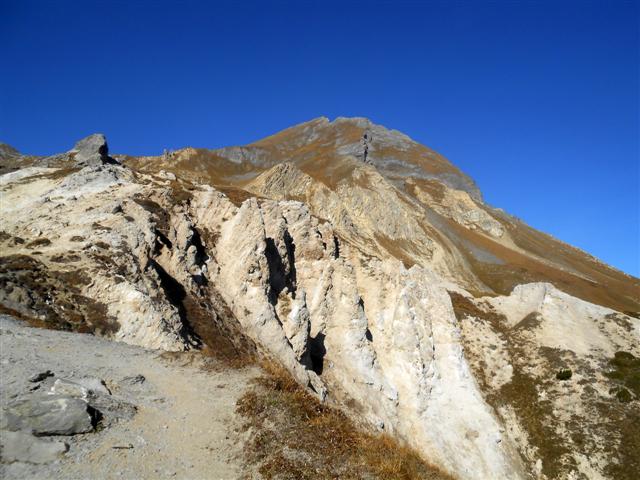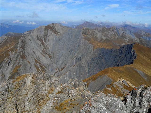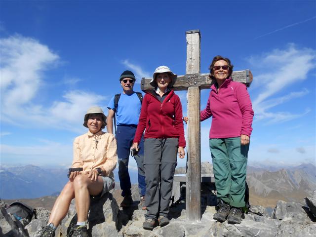 Jeudi 28 septembre, par beau temps, nous avons gravi à 5, ce sommet situé à l'est de Saint Jean de Maurienne. Partis de la Saussaz, à 2090 m, dans un décor déjà automnal et très coloré, nous sommes passés par le Petit Col des Encombres (2329 m). Le sentier cheminait ensuite parmi les gypses et les cargneules, longeait des gouffres impressionnants, lorgnait sur les reliefs feuilletés ou sculptés, rejoignait une harde de bouquetins tranquilles, et nous amenait enfin en se redressant, au replat panoramique sur lequel est édifiée la croix en bois du sommet (2825 m).