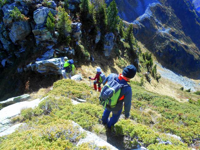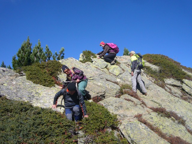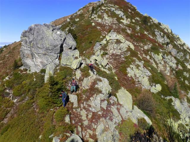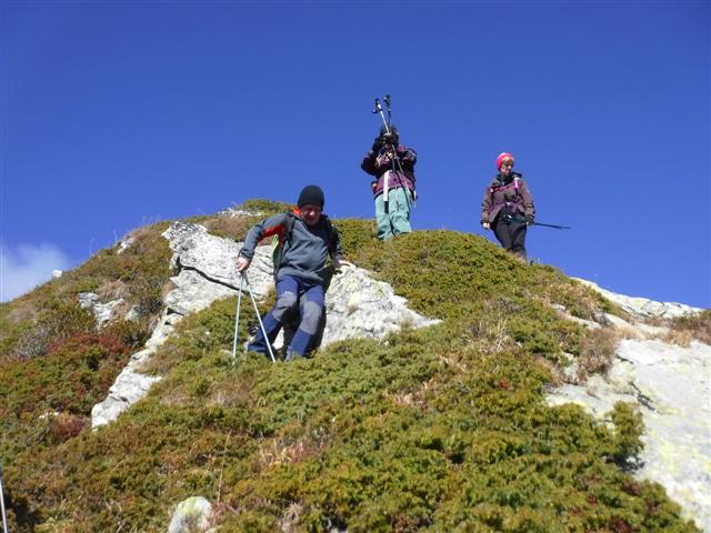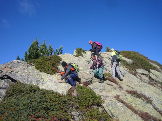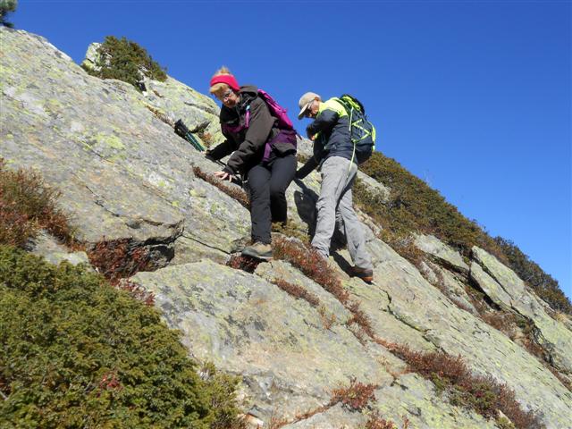 Soleil ! Nous continuons la traversée sur l'arête sud-est qui ramène au col du Gollet : nous empruntons une mini-trace coupée d'échancrures rocheuses et parfois de petites dalles à traverser avec légèreté, doigts sur l'arête tranchante et pieds sur les prises assez franches ; "ça me donne envie de refaire de l'escalade", dira l'une d'entre nous !