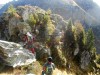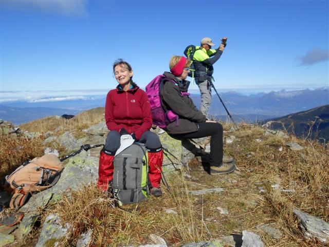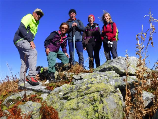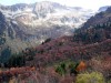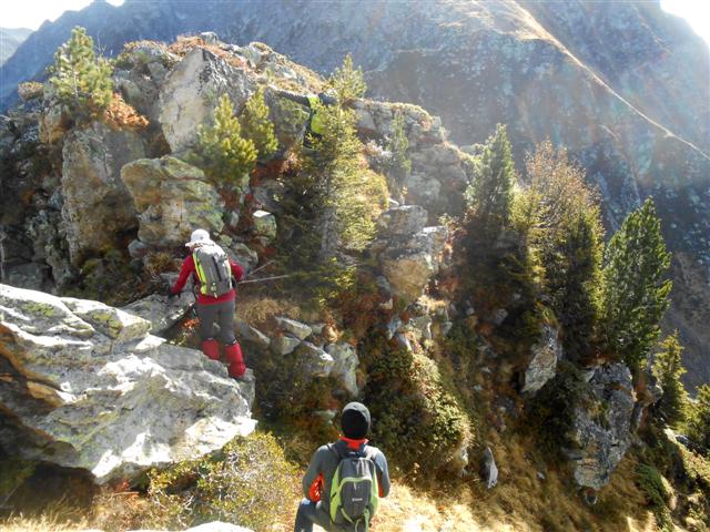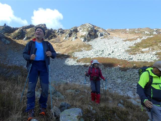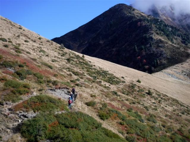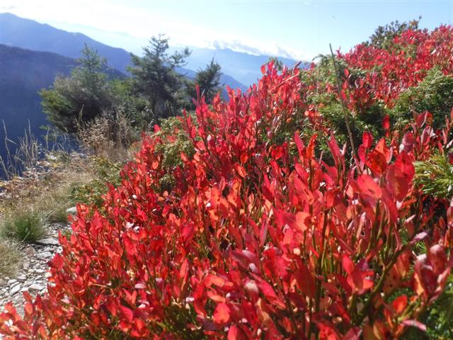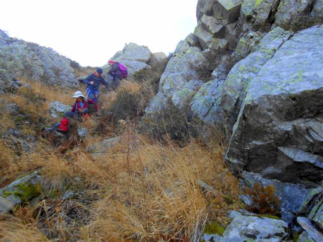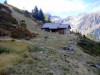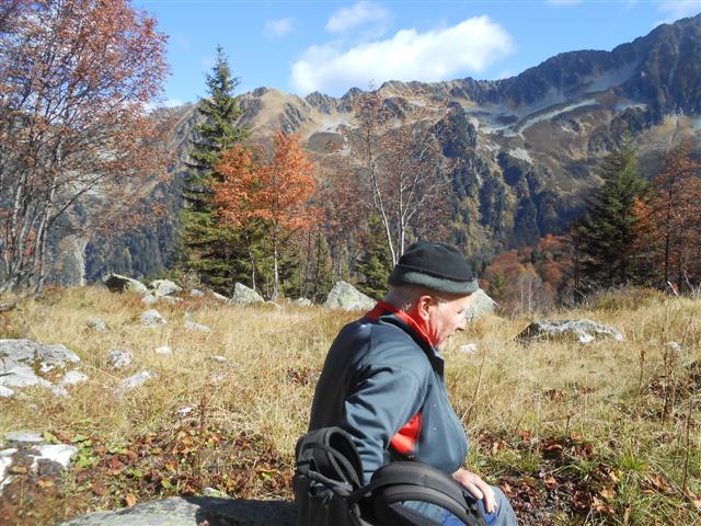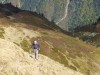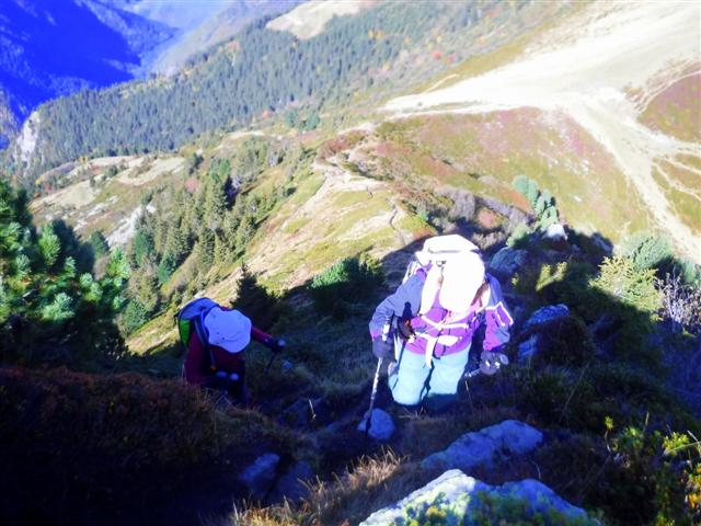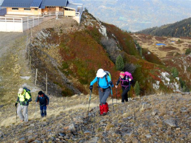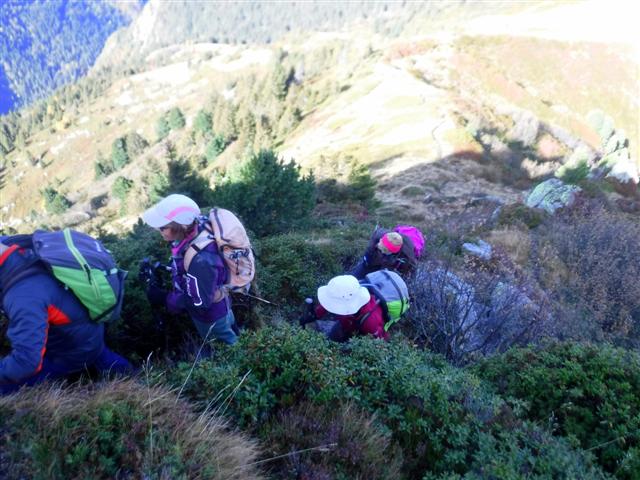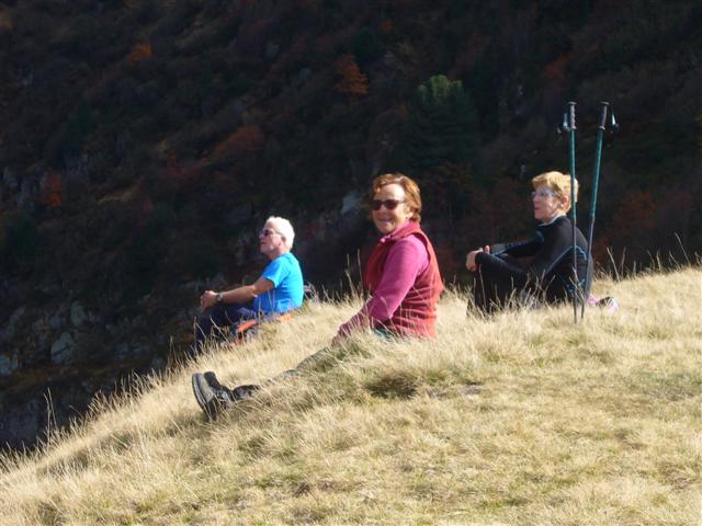 Au col du Gollet (2095 m), nous optons pour la descente par le vallon de la Balme, jusqu'à proximité des ruines du chalet de la Balme (1695 m). La pente est assez raide au début, avec des rochers humides et des fougères déjà brunies par le gel, de grandes herbes ocres glissantes et ...de la caillasse ; nous cheminons tant bien que mal hors sentier, repérant les zones plus accessibles, profitant des bosquets de vernes sous lesquels nous passons avec souplesse, et enfin nous choisissons comme lieu du casse-croûte, la jonction avec le G.R. 738 venant de Pré Nouveau et remontant à Claran. Dos calé au rocher ou face au panorama développé sur la rive droite du Bens, chacun se restaure, médite silencieusement ou partage ses friandises : il est 13 heures passées ! La vie est belle, on entend presque le zéphir tintinabuller...