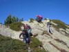 Descendus au col de Claran (1953 m), nous remontons ensuite l'arête nord-ouest du Petit Charnier. Les marches sont hautes, on empoigne parfois les arbustes, et les versants sont bien raides, couverts d'une végétation de pins rabougris, myrtilliers, rhododendrons. L'arrivée au sommet (2181 m) se fait par une arête horizontale, dégageant la vue sur le majestueux Grand Charnier en premier plan, et bien sûr, notre environnement montagnard de Belledonne nord.