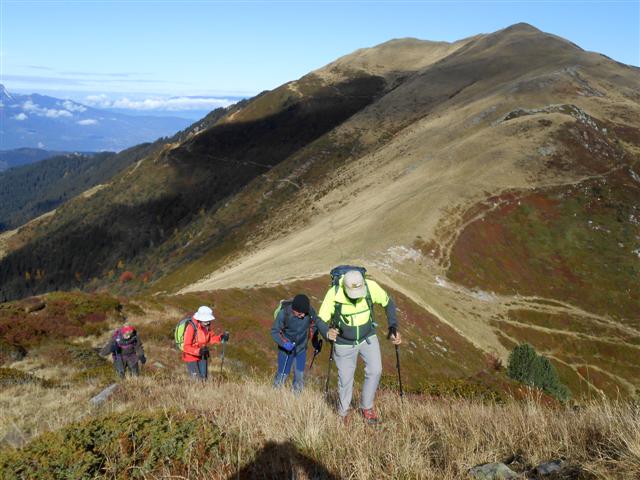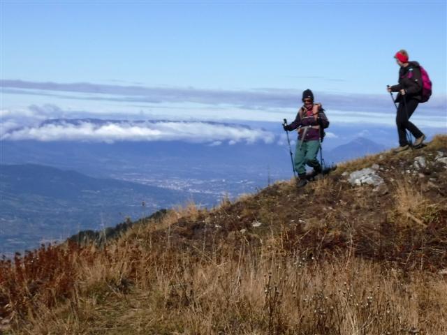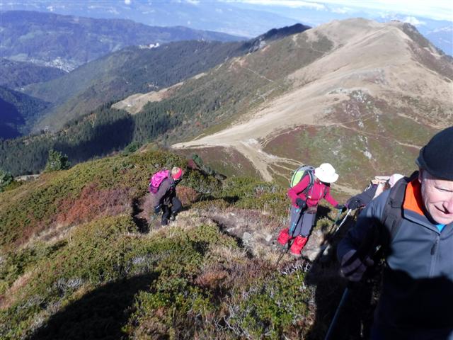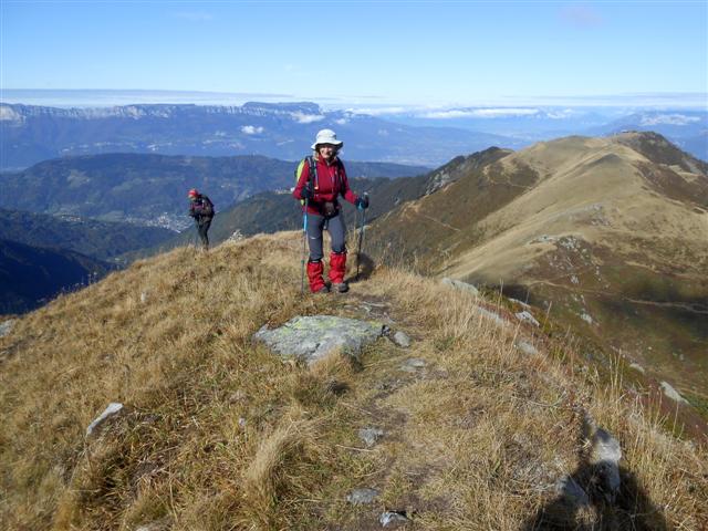Dimanche 8 octobre. Partis du Super collet d'Allevard (1640 m), nous rejoignons les crêtes qui conduisent aux Plagnes (2092 m), en surplombant les anciens alpages du Purgatoire, du Clapier et d'Orgeval, versant Bens ; ce sont de petits vallons transversaux, orientés est/nord-est, entrecoupés de replats humides où s'étalent des mares à linaigrettes et autres plantes "aquatiques". Magnifique et reposant !